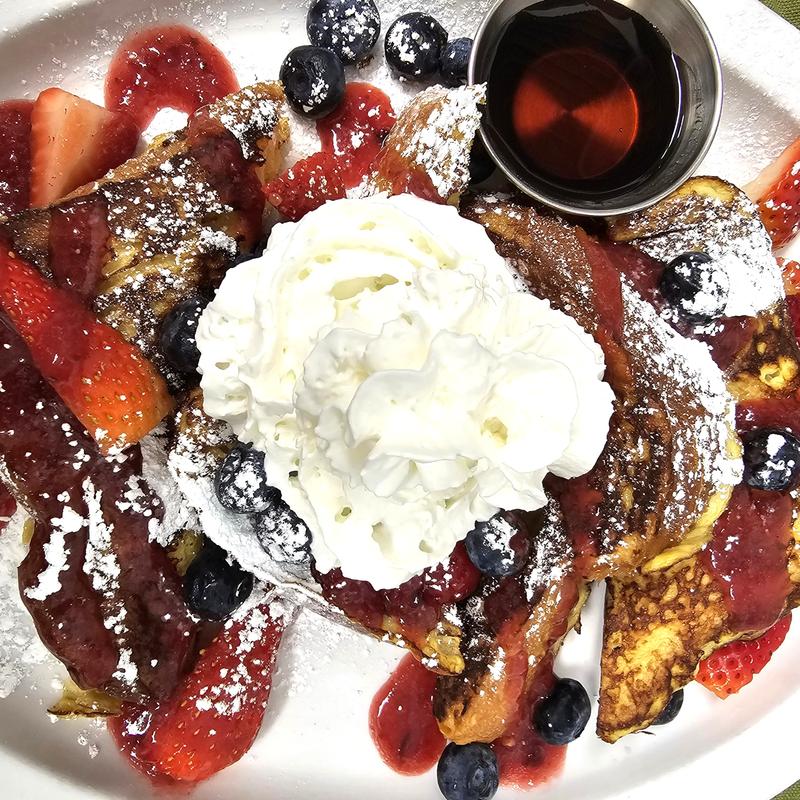 Bourbon-soaked brioche, whipped cream, side maple syrup, powdered sugar, and fresh berries • Add bacon +$5.00