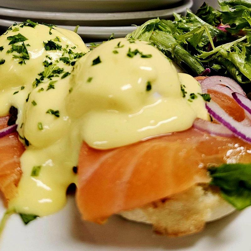 English muffin, smoked salmon, arugula, 2 poached eggs, hollandaise, capers, red onions.