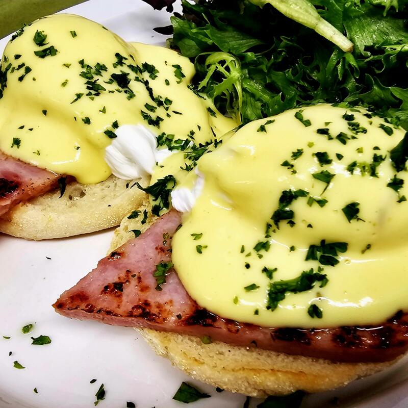 English muffin, ham, 2 poached eggs, hollandaise.