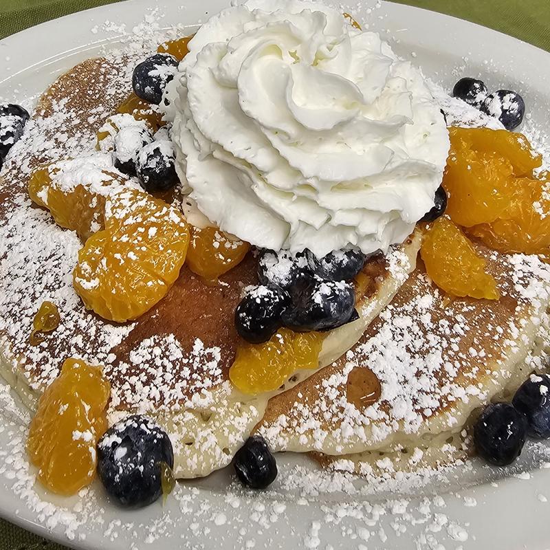 House-made ricotta pancakes, whipped cream, mandarin orange supremes, blueberries, side maple syrup, and powdered sugar.